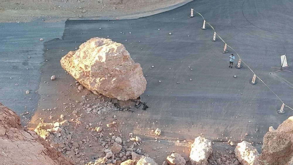 Judging from a Thursday film of a landslide at the bypass entrance and the boulder that remained, it may be a while before the bypass is open. While this specific landslide didn’t happen prior to Wednesday’s council meeting, the erosion problem and possible solutions are mentioned. Afton Moore, the City Manager, shares a brief report here.