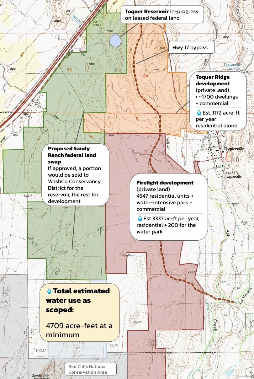 To compound the problem, local politicians have a hard time saying no to developers over the objections of residents, many of whom have voiced a preference for a more rural lifestyle. Take Toquerville for example. If the two huge Toquer Ridge and Firelight developments are built to master plan capacity, they would consume a minimum of 4700 acre-feet of water combined, not accounting for landscaping (interactive map). The proposed Firelight water park alone would consume enough water for 290 homes. Ivins, which has implemented the strictest water conservation measures in the area, still greenlit a massive new golf resort, Black Desert. The resort lauds itself for not drawing from the municipal water supply, yet it's still tapping into the same aquifer system that we all rely upon.